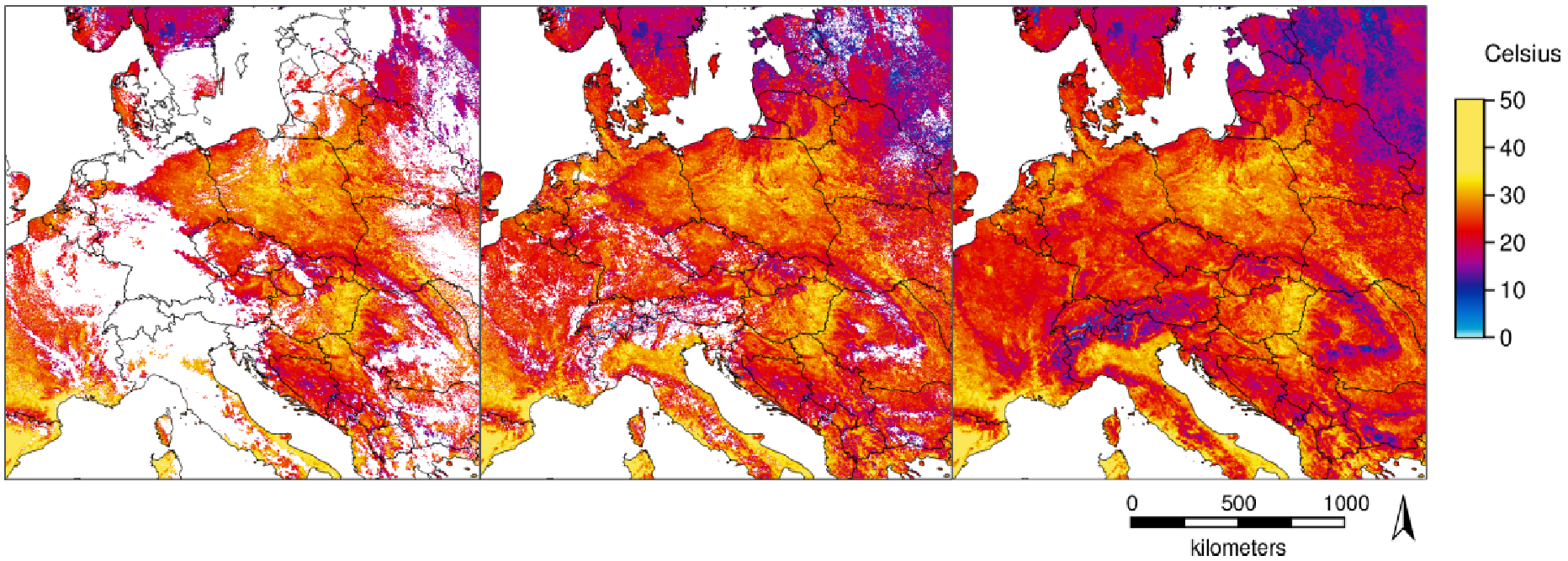 Temperature time series with high spatial and temporal resolutions are important for several applications. The new MODIS Land Surface Temperature (LST) collection 6 provides numerous improvements compared to collection 5. However, being remotely sensed data in the thermal range, LST shows gaps in cloud-covered areas. With a novel method [1] we fully reconstructed the daily global MODIS LST products MOD11A1/MYD11A1 (spatial resolution: 1 km). For this, we combined temporal and spatial interpolation, using emissivity and elevation as covariates for the spatial interpolation. The data are provided in GeoTIFF format. The Coordinate Reference System (CRS) is identical to the MOD11A1/MYD11A1 product (Sinusoidal) as provided by NASA. In WKT as reported by GDAL: PROJCRS["unnamed", BASEGEOGCRS["Unknown datum based upon the custom spheroid", DATUM["Not specified (based on custom spheroid)", ELLIPSOID["Custom spheroid",6371007.181,0, LENGTHUNIT["metre",1, ID["EPSG",9001]]]], PRIMEM["Greenwich",0, ANGLEUNIT["degree",0.0174532925199433, ID["EPSG",9122]]]], CONVERSION["unnamed", METHOD["Sinusoidal"], PARAMETER["Longitude of natural origin",0, ANGLEUNIT["degree",0.0174532925199433], ID["EPSG",8802]], PARAMETER["False easting",0, LENGTHUNIT["Meter",1], ID["EPSG",8806]], PARAMETER["False northing",0, LENGTHUNIT["Meter",1], ID["EPSG",8807]]], CS[Cartesian,2], AXIS["easting",east, ORDER[1], LENGTHUNIT["Meter",1]], AXIS["northing",north, ORDER[2], LENGTHUNIT["Meter",1]]] Acknowledgments: We are grateful to the NASA Land Processes Distributed Active Archive Center (LP DAAC) for making the MODIS LST data available. The dataset is based on MODIS Collection V006. Meaning of pixel values: The pixel values are coded in Kelvin * 50 Data type: raster, UInt16 Spatial resolution: 926.62543314 m Spatial extent Sinusoidal (W, S, E, N): 0, 4447802.079066, 2223901.039533, 6671703.118599 Spatial extent in EPSG:4326 (W, S, E, N): 0, 40, 40, 60 [1] Metz M., Andreo V., Neteler M. (2017): A new fully gap-free time series of Land Surface Temperature from MODIS LST data. Remote Sensing, 9(12):1333. DOI: http://dx.doi.org/10.3390/rs9121333