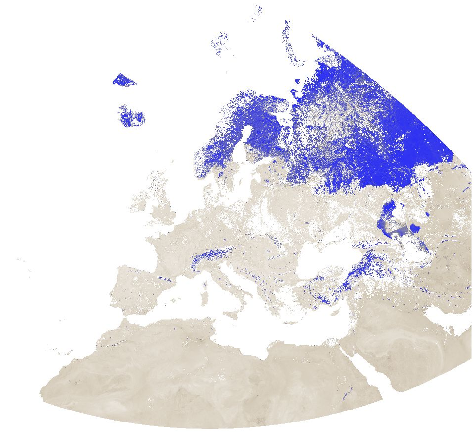 Modified Normalized Difference Water Index (MNDWI) from MODIS data for Europe at 1 km resolution. Source data: - MODIS/Terra Surface Reflectance 8-Day L3 Global 500 m SIN Grid (MOD09A1 v006): https://lpdaac.usgs.gov/products/mod09a1v006/ The corresponding MODIS/Aqua product (MYD09A1 v006) could not be used due to the fact that the Aqua satellite has a number of broken detectors resulting in unreliable data for band 6 (SWIR) measurements. The Moderate Resolution Imaging Spectroradiometer (MODIS) Terra MOD09A1 Version 6 product provides an estimate of the surface spectral reflectance of Terra MODIS Bands 1 through 7 corrected for atmospheric conditions such as gasses, aerosols, and Rayleigh scattering. Along with the seven 500 meter (m) reflectance bands are two quality layers and four observation bands. For each pixel, a value is selected from all the acquisitions within the 8-day composite period. The criteria for the pixel choice include cloud and solar zenith. When several acquisitions meet the criteria the pixel with the minimum channel 3 (blue) value is used. For the time periods October 2016 - March 2017 and August 2020 - April 2021, the original data has been reprojected to ETRS89-extended / LAEA Europe and aggregated to a 1 km grid. The temporal resolution is 8 days. Bad quality pixels (cloud, cloud shadow, dead detector, solar zenith angle too large, etc.) have been masked using the provided quality assurance (QA) layers and appear as "no data". File naming: productCode.acquisitionDate[A (YYYYDDD)]_mosaic_spatialResolution_frequency_VI.tif example: MOD09A1.A2016353_mosaic_1000m_8_days_MNDWI.tif The date is Year and Day of Year. Values are MNDWI * 10000. Example: Value -5099 = -0.5099